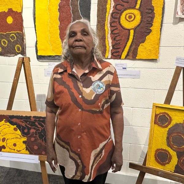 Aunty Hazel is a respected Kalkadoon Elder from Mount Isa, known for her unique and powerful artworks crafted from Spinifex and other wild grasses. These natural materials are transformed into striking visual pieces, coloured with the vibrant ochres found throughout Kalkadoon Country.