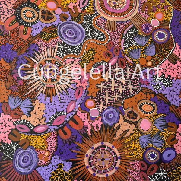 We paint our traditional homelands with deep reverence for the landscape, because this country holds our story. It’s where our mother and father call home, where we were raised, and we are now raising our own children. This land is rugged and raw- shaped by time, seared by heat, and rich with colour. The ochres have been pushed to the surface, revealing gold, silver and minerals that form one of the world’s moat unique mineral belts. We are guided by the country, the peach-toned skies, the soft blues, pinks and purples of our well-known Kalkadoon sunsets. These deep connections inspire us to paint using traditional shaped and symbols, brought to life through a modern, unrestricted palette. Each piece reflects a contemporary interpretation of our heritage. All artworks are created by Glenda, Cheryl,Dale, Jaunita – four sisters, each with their own individual styles