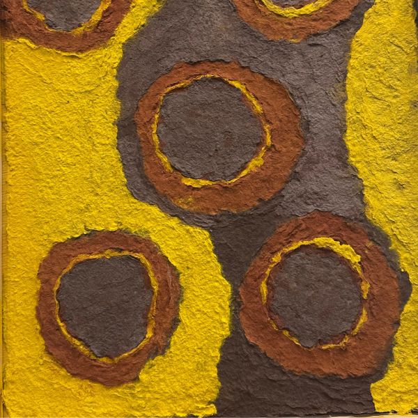 The pulp is then washed and infused with natural ochres. These earth-derived pigments produce a rich palette, ranging from deep chocolate browns and tobacco reds to warm oranges, blood reds, and soft creams and yellows. With patience and care, Aunty Hazel shapes and pats the coloured pulp into form, bringing her artistic vision to life.